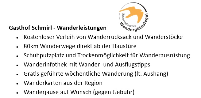 Anreisetag bei Wochenpauschalangeboten ist Samstag od. Sonntag. Der Preis für „Schmirls Wanderwoche“ ist in Euro und gilt pro Person & Woche im Komfortzimmer (inkl. Mehrwertsteuer & exkl. € 21,- NÖ Nächtigungstaxe / Woche). Aufpreis für Exklusivzimmer € 4,-, Exklusivzimmer Plus € 7,- pro Person/Tag. Nicht in Anspruch genommene Leistungen können nicht rückvergütet werden. Änderungen vorbehalten.